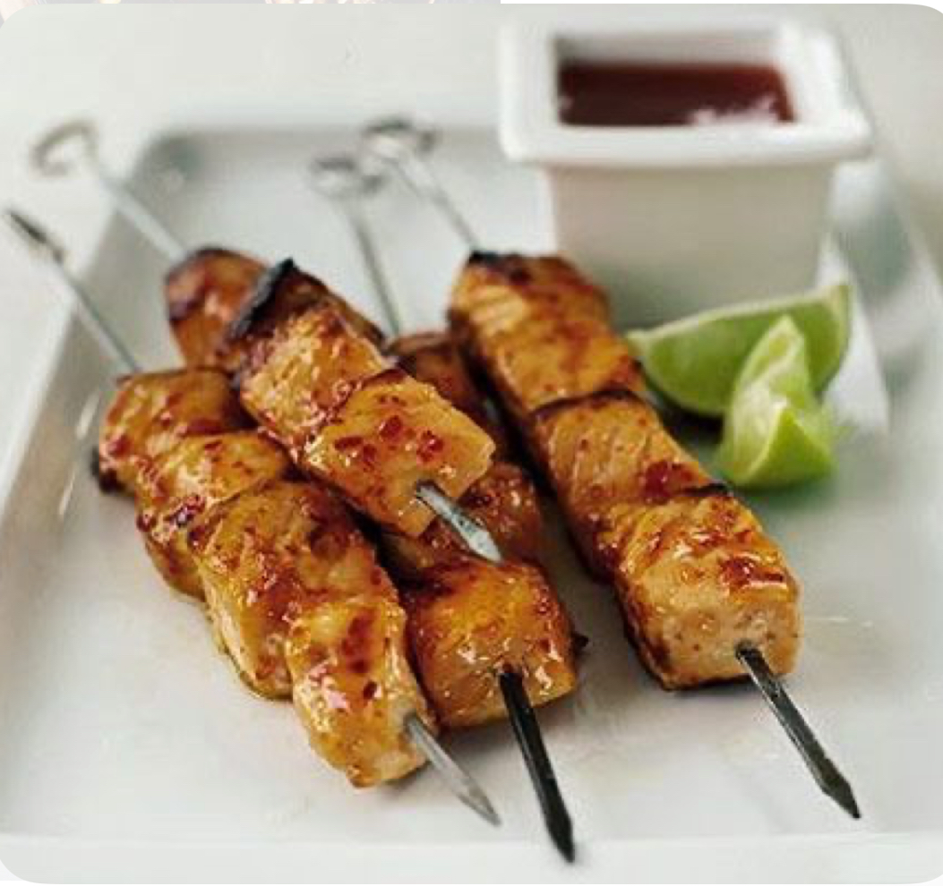 Kycklingspett med jordnötssås, friterad kyckling med sötsursås, kyckling i röd curry