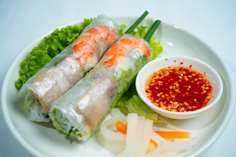 Fresh spring rolls with shrimp, pork, vermicelli, herbs (vegan option available)