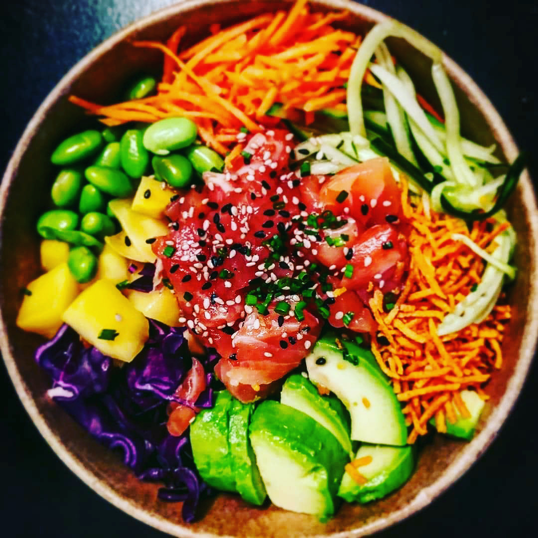 Sushi rice, salad mix, edamame, avocado, cucumber, seaweed salad, mango, tomato, chili mayo & teriyaki sauce