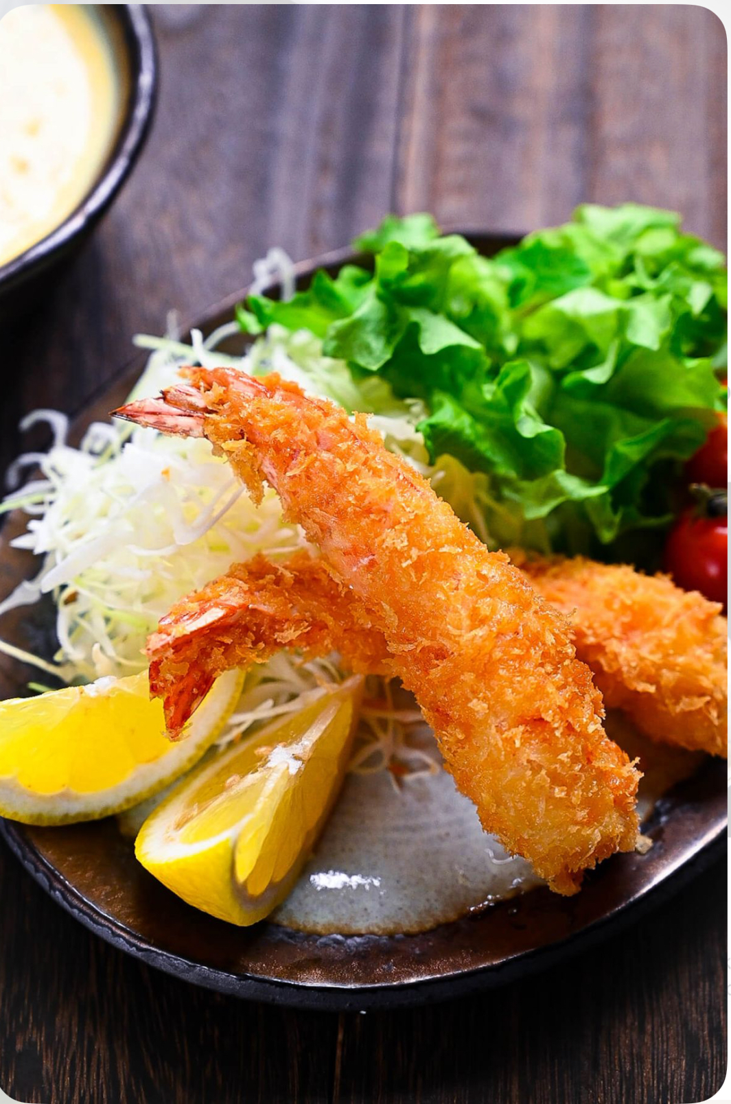 Breaded shrimp, avocado, cucumber, topped with crabstick mix